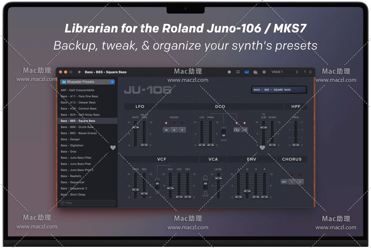 106 Editor for Mac 是一款Roland Juno-106/MKS7合成器音色库管理器,用于记录、调用和整理硬件预设。106 Editor for Mac允许您管理、加载和保存Juno-106/MKS7合成器的预设,这要归功于您的MIDI界面。预设作为Sysex文件存储在硬盘上,可以根据需要命名和组织到多个目录中。