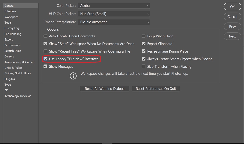 尽管我们不作这样的推荐,但是您可以禁用最新的“新建文档”体验,转为使用Photoshop默认提供的“新建文件”体验。