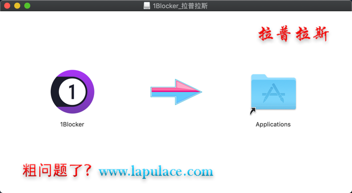 1、软件下载完成后,打开安装包如上图,拖动软件【1Blocker】到 Applications 进行安装。