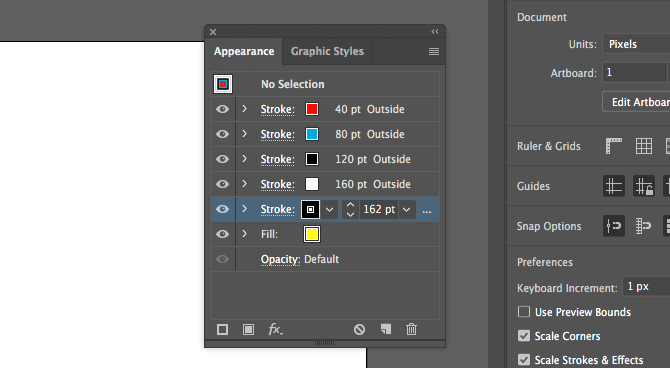 画一个80px的圆圈。将填充设置为黄色,将笔划设置为红色,宽度为40pt。单击“笔触”选项下的虚线,并将“对齐笔触”设置为“将笔触与外部对齐”。 现在,通过“窗口”菜单打开“外观”面板,或按Shift + F6。选择笔触,然后单击“复制所选项目”。这将在现有笔划上方创建一个副本。 选择下面的一个(我们希望原始笔画在上面),然后将颜色设置为蓝色,大小设置为80pt。然后复制。