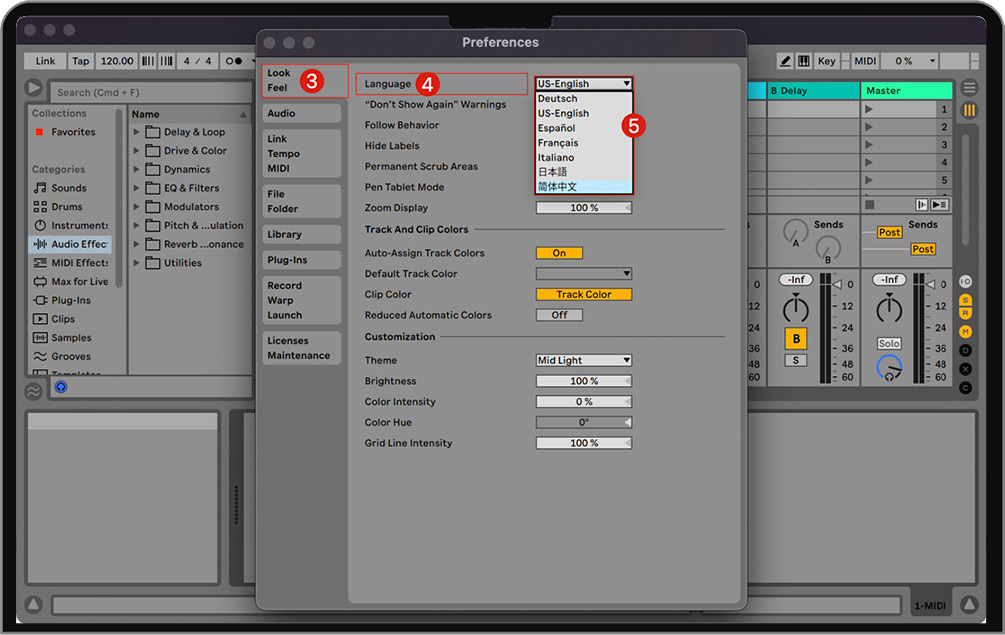 弹出偏好设置窗口之后,在“Look Feel”选项卡的“Language”选择自己需要的语言(如简体中文)后重启Live即可。