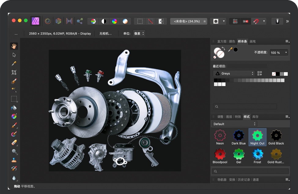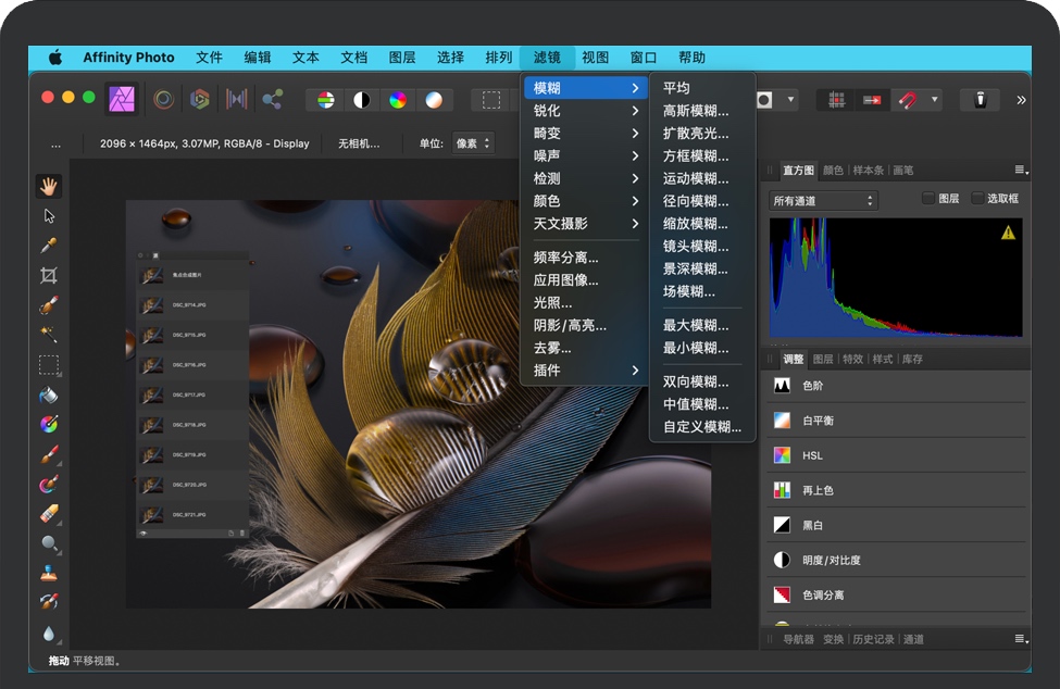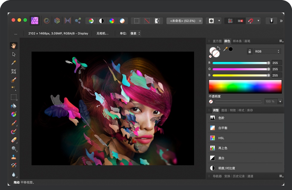 除了支持无限图层外,Affinity Photo 还提供了完整的调整、效果和实时滤镜库,所有这些都可以进行分组、裁剪、遮蔽或混合到一起以创建极其复杂的图像构图。