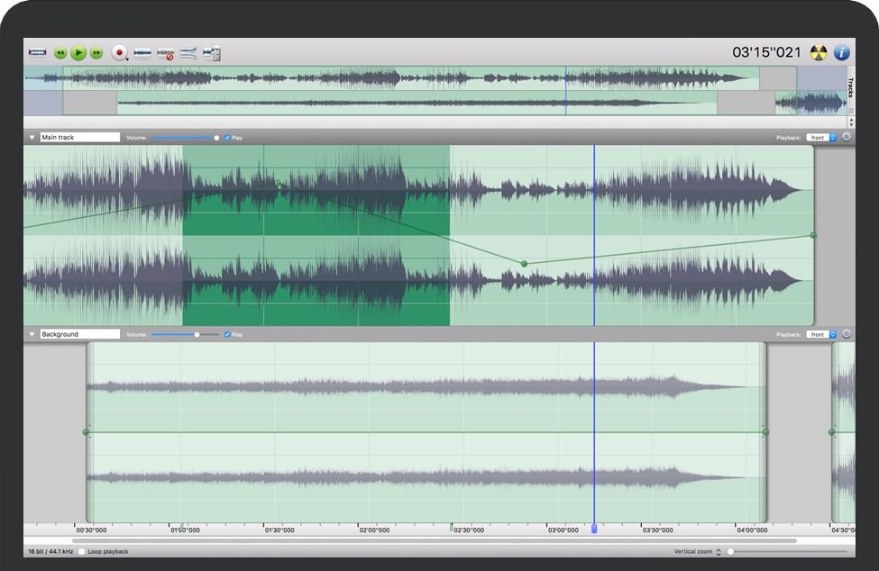 Amadeus Pro是功能齐全的多轨编辑器。每个音轨的音量和声像都可以独立于其他音轨进行调整。每个音轨可以分为多个音频片段,可以轻松地相互独立拖动。此外,音频单元可以实时应用于各个轨道,而无需进行任何破坏性的编辑。