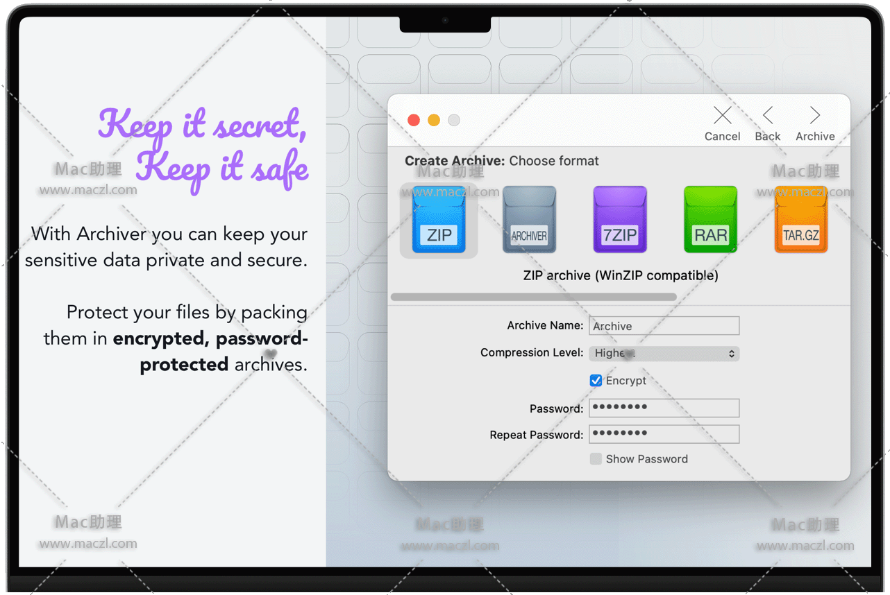 使用Archiver,您可以将敏感文件打包在经过密码保护的加密归档中,以保护它们。