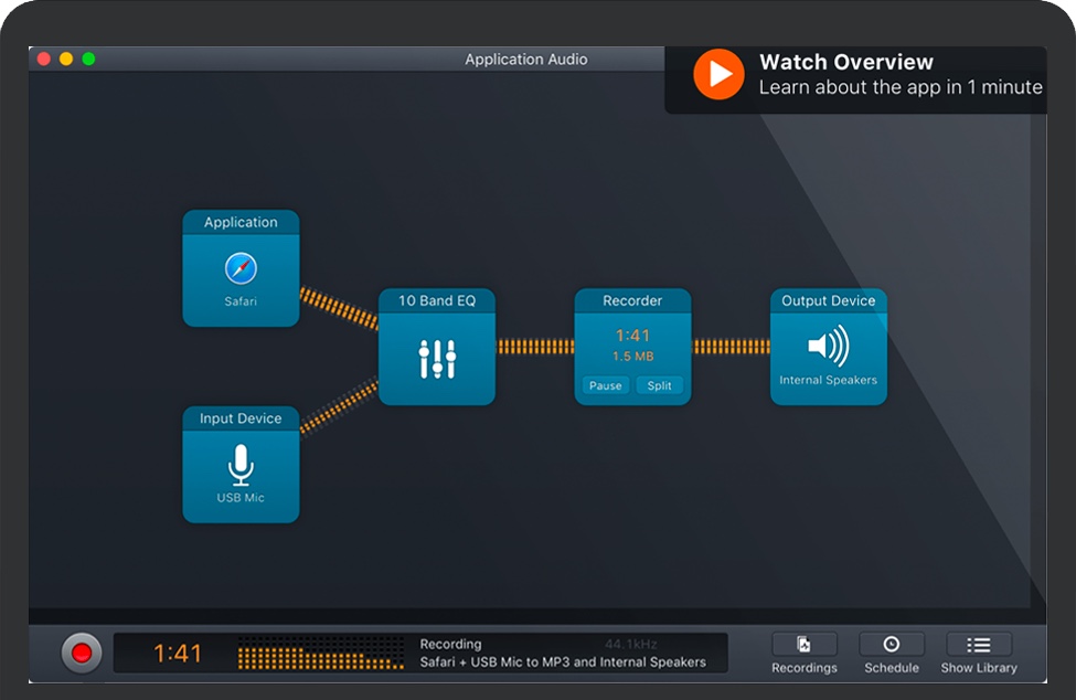将 Audio Hijack 与我们的实用程序Loopback 结合使用,从一个应用程序捕获音频,对其进行调整,然后将其发送到另一个应用程序。