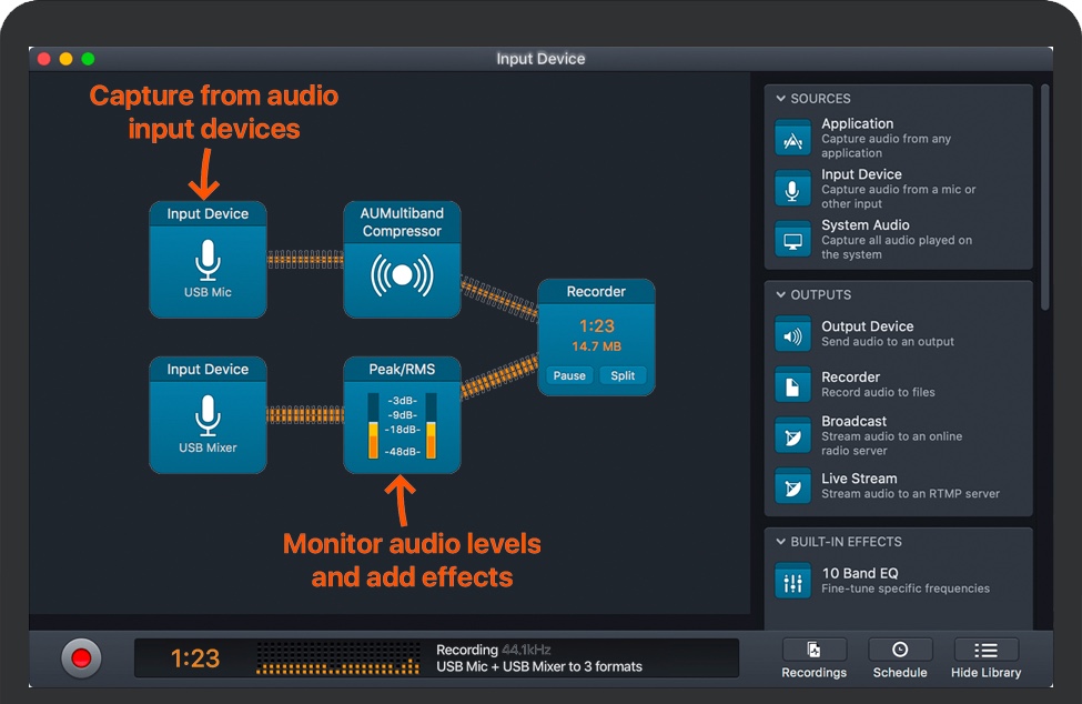 Audio Hijack 直观的音频网格提供了一个非常棒的管道式视图,可以准确显示音频的流动方式,因此您可以轻松理解它。