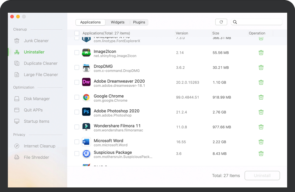 电源卸载程序卸载不需要的应用程序并删除所有剩余的。 | ![]() 重复查找器查找和删除Mac上的重复文件。 | ![]() 大文件查找器查找并删除无用的大文件以获得更多可用磁盘空间。 | ![]() 磁盘管理器在Mac上管理磁盘信息和格式化磁盘驱动器。 |