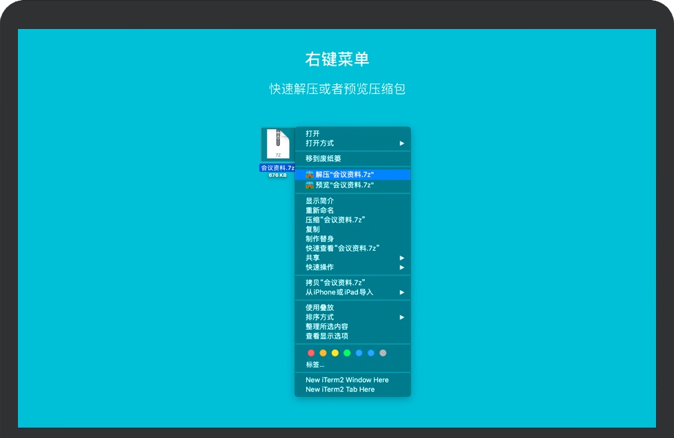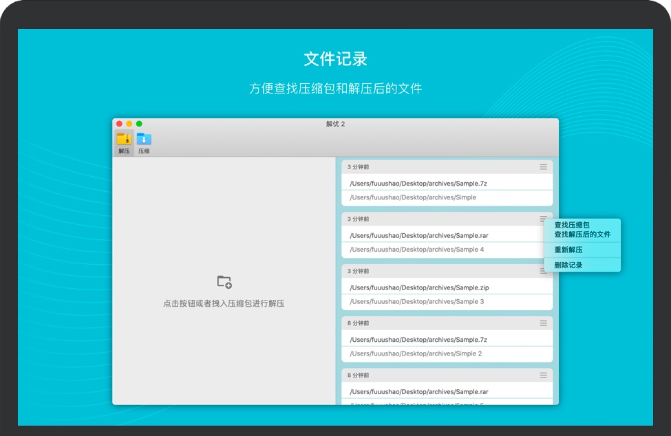 您可以拖动文件到“解优 2”图标进行解压,也可以设置“解优 2”为压缩包的默认打开方式后鼠标双击进行解压。