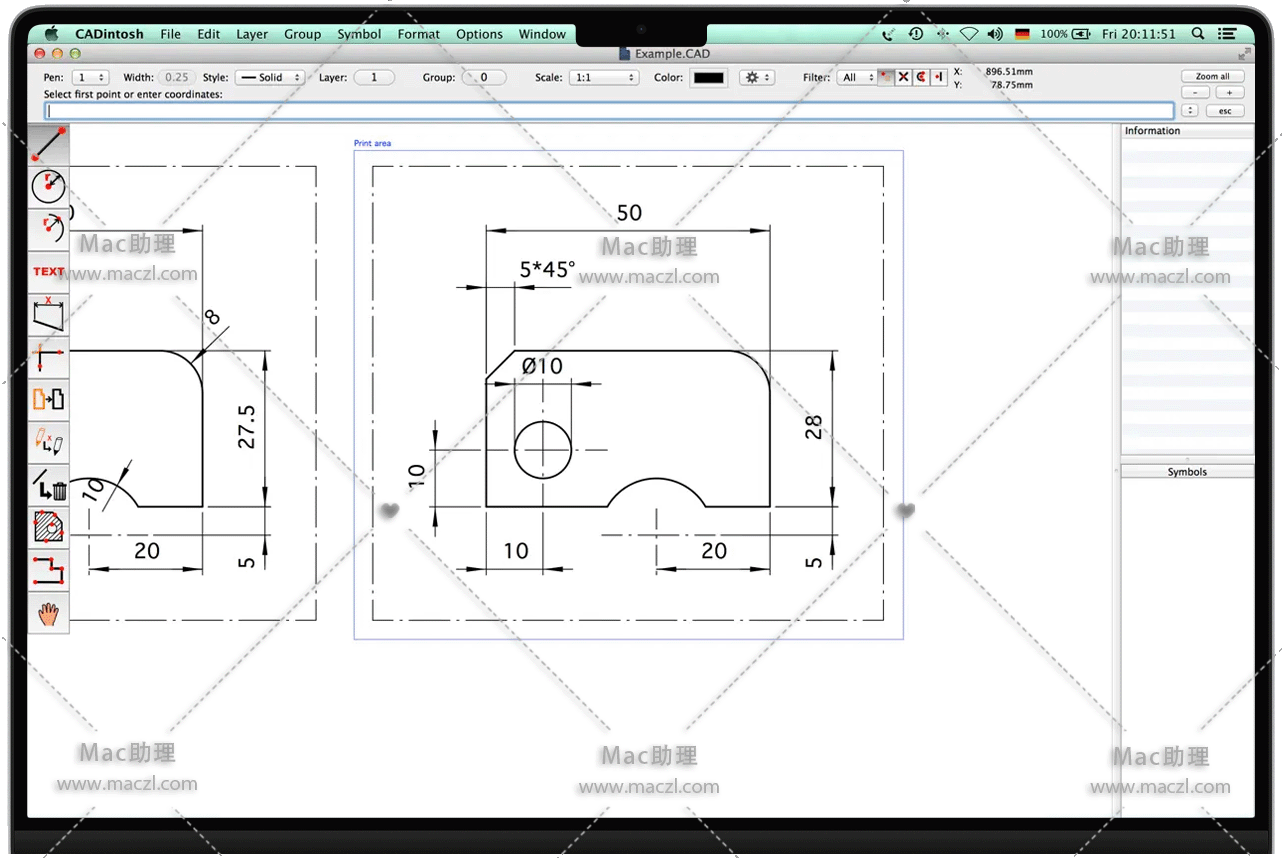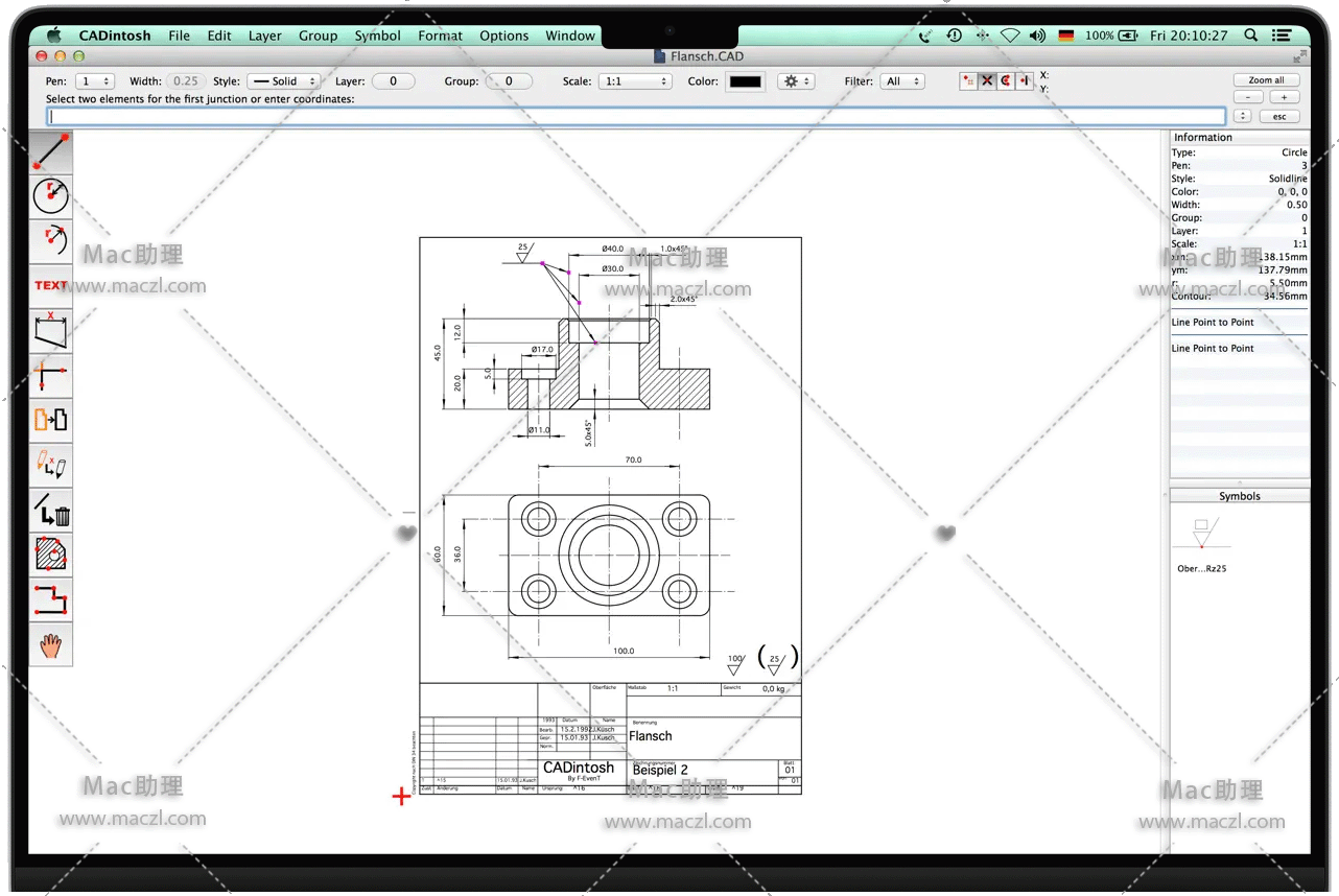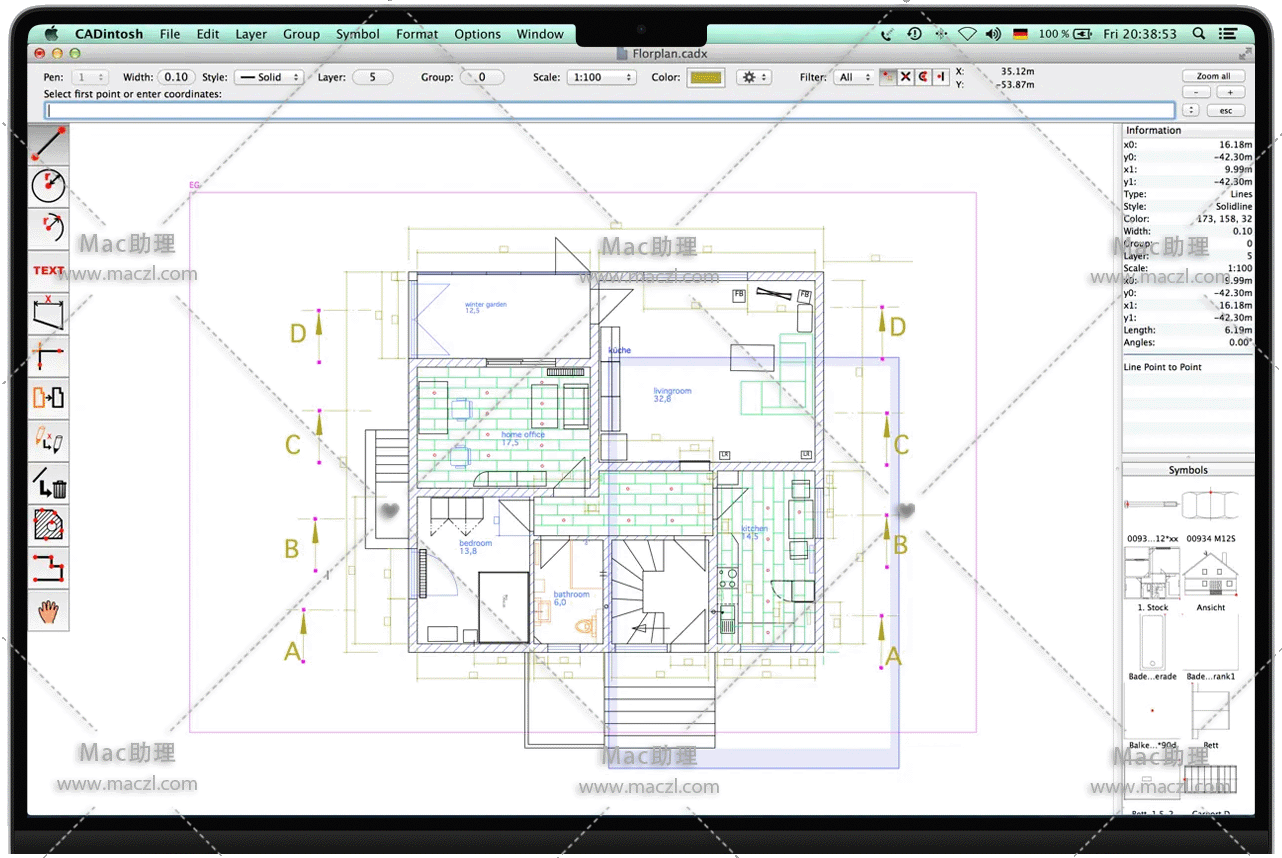 CADintosh X for Mac 是一个面向技术制图员和设计师的高性能2D CAD程序。可以用来绘制房屋平面图。如果您以前使用过QuarkXPress和Photoshop等图形程序,您会发现CADintosh中使用的方法完全不同。在这些程序中,您可以使用矩形工具在一个动作中绘制矩形。CADintosh没有这种工具,因为线条被用作技术图纸的基础。