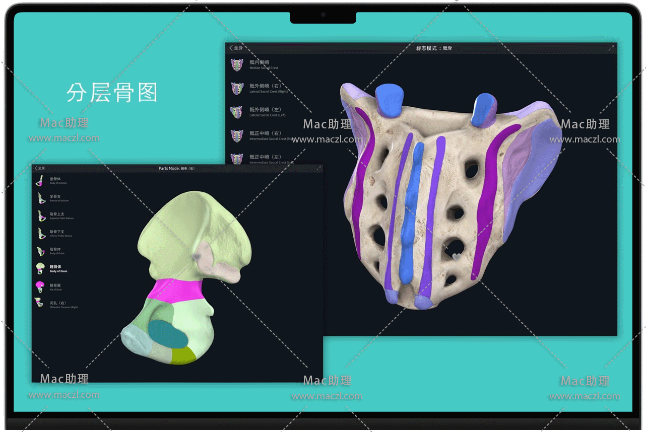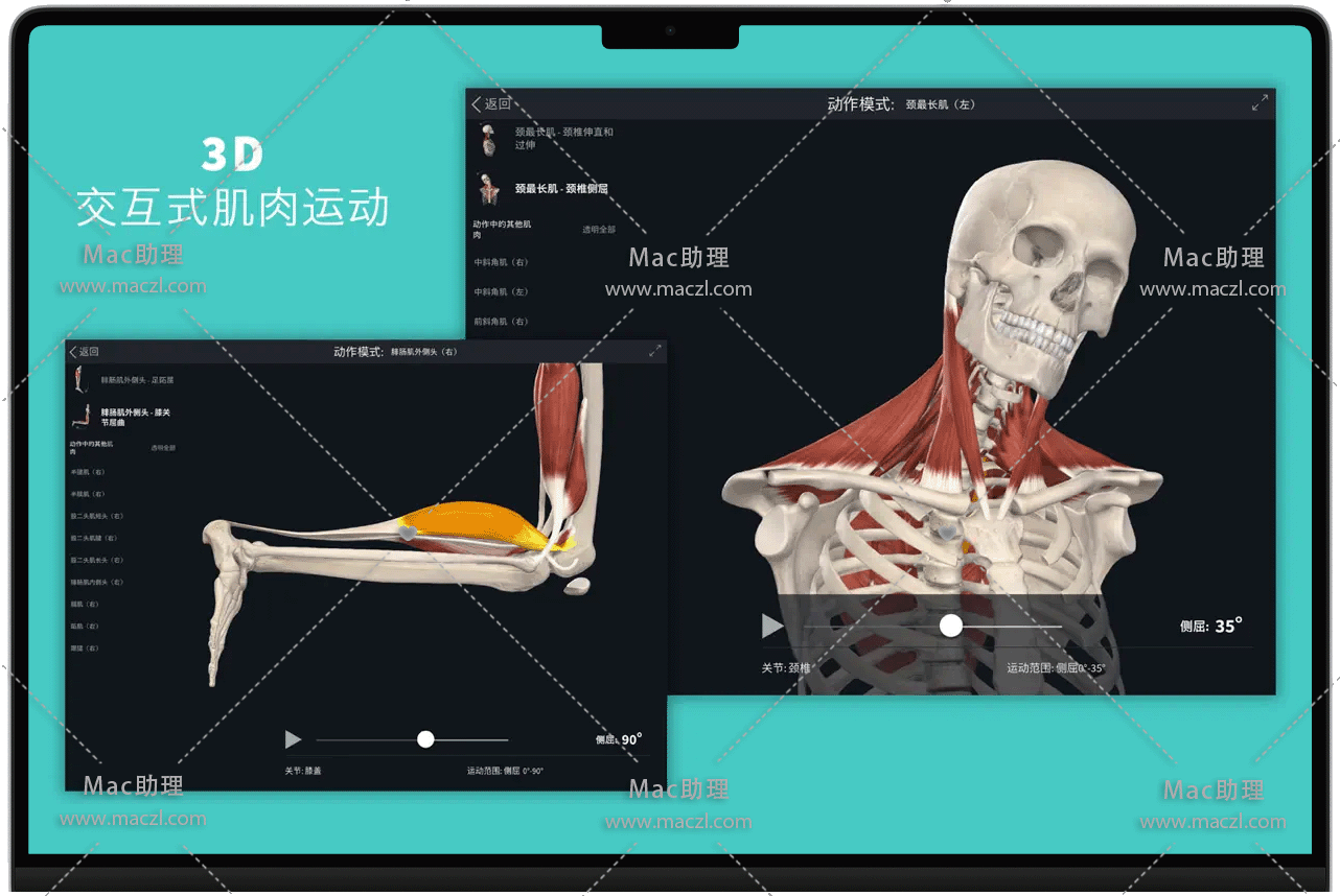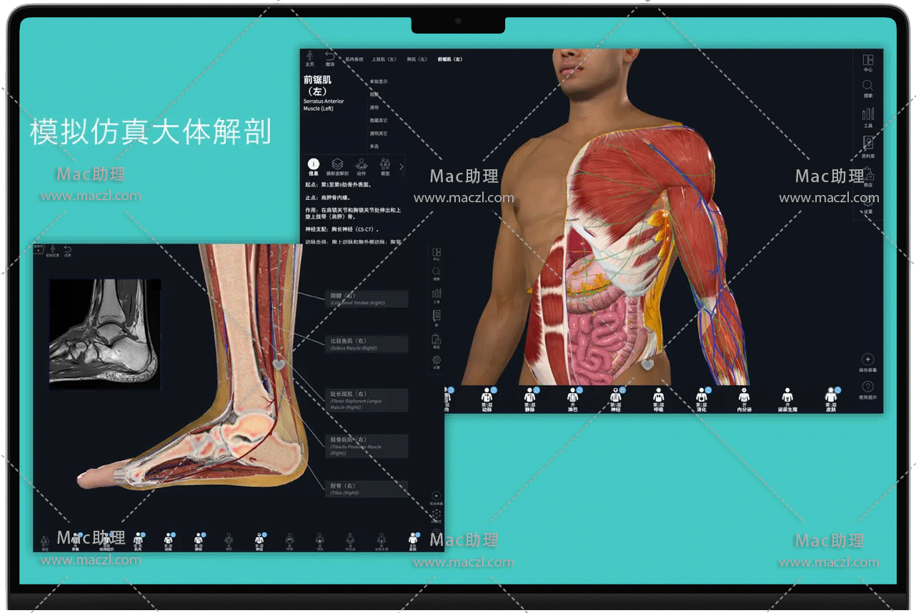 动态断面解剖、实时肌肉运动、肌肉起止点、骨表面和骨性标志、12个分层人体系统、神经示踪、血供示踪