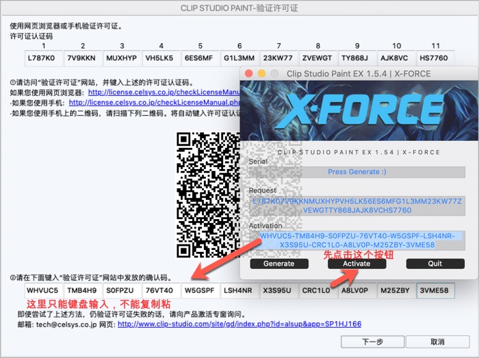 2、安装完成后,打开软件「CLIP STUDIO」提示验证许可证,输入软件包中的序列号,点击“激活产品“,如下图。(提示:软件界面不支持复制粘贴,需要辛苦下手动输入。为了不必要的麻烦,输入完成之后复查下。)