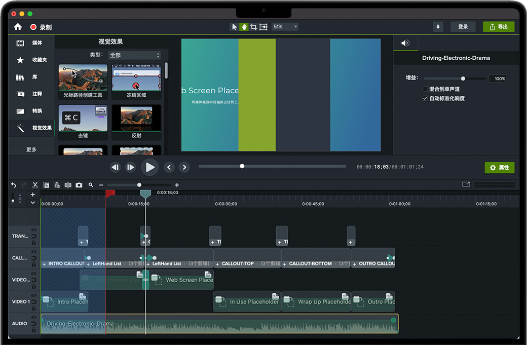 Camtasia for 教学设计人员准备好“哇!”你的观众了吗?Camtasia拥有在创纪录的时间内创建令人难以置信的视频所需的一切。通过效果、过渡、音乐等,轻松为您的视频添加流行音乐和活力。最棒的是,它们非常容易找到、使用和定制,让您有更多的时间进行创建。 |