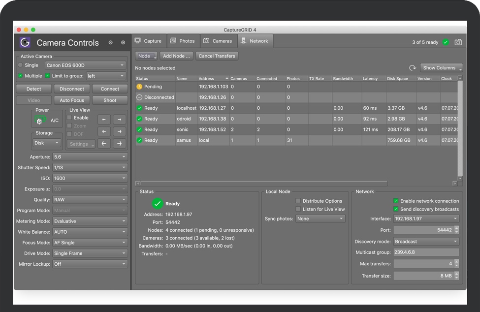 连接并同步所有计算机后,用户可以仅从其中一台计算机操作该应用程序,以获取所有摄像机和照片的统一视图,并可以同时在所有摄像机上执行操作。