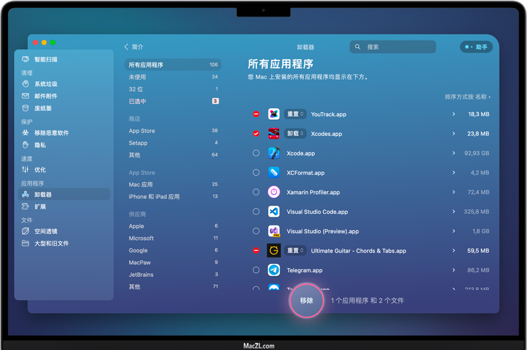 为了使您的Mac生活更加有序,您将获得卸载程序和更新程序的酷二重奏。前者完全删除不需要的应用程序,后者会立即更新您的所有软件。糟糕的应用程序会消失,而新的应用程序总是准时到达。这有助于解决软件冲突,让您的 Mac 永远年轻。