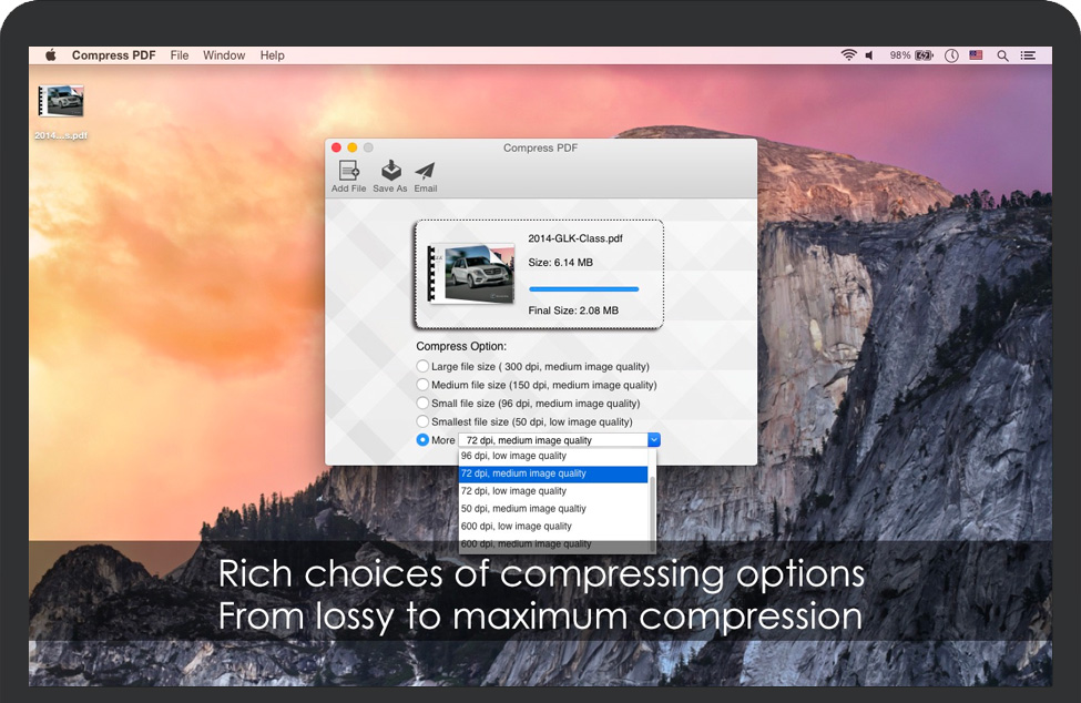 Compress PDF for Mac主要通过降低嵌入图像的质量和大小来减小PDF文件的大小。您可以从50、72、96、150或300 dpi中进行选择,每个dpi选项都有2个质量级别-低、中。