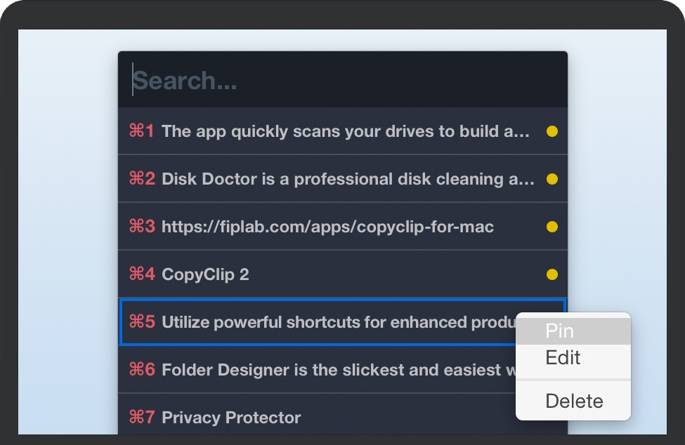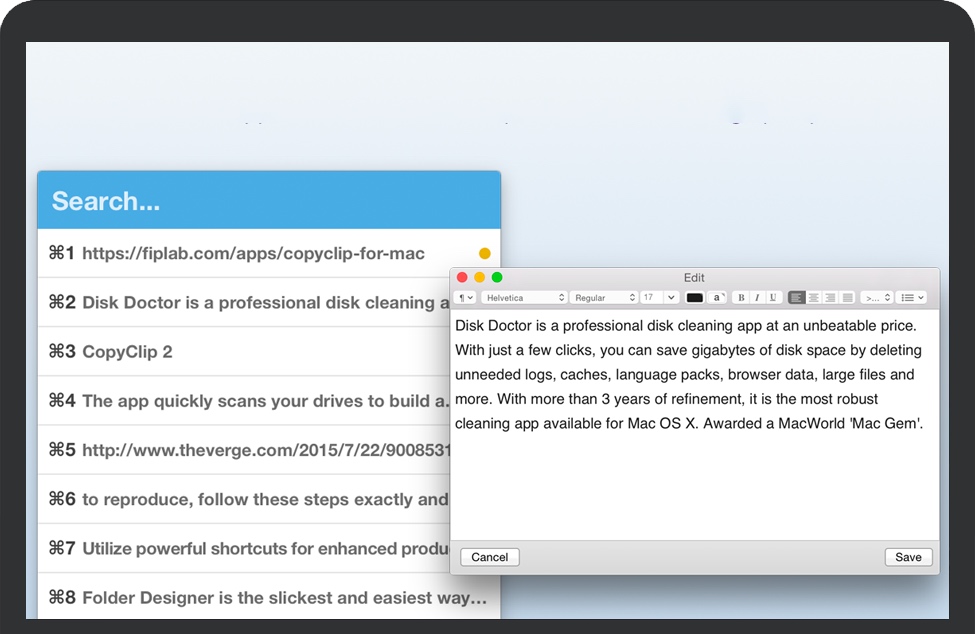 CopyClip 2带有一个功能强大的搜索栏,对于查找包含您过去复制的某些文本或字符的剪辑特别有用。您可以轻松地选择搜索结果,并将其粘贴到所需的位置。