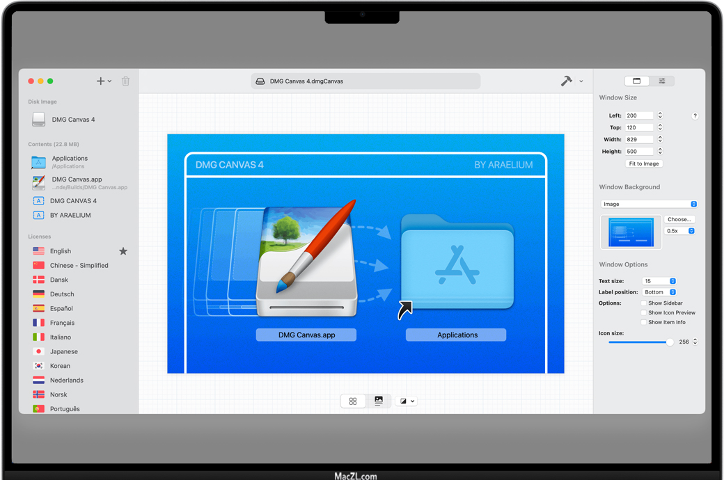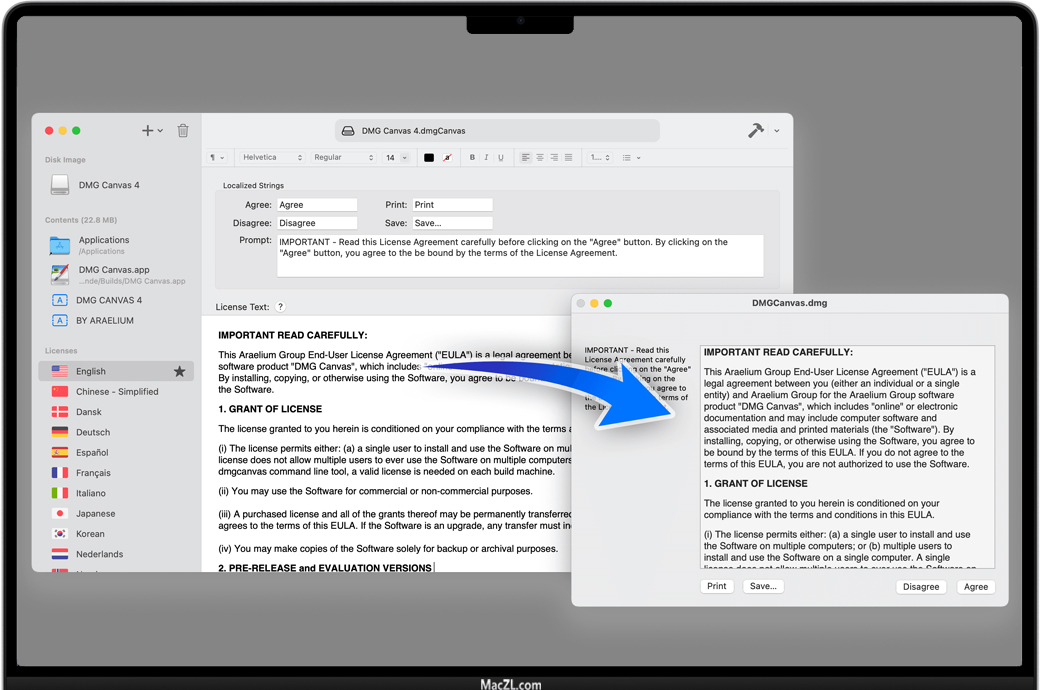 我们都见过挂载磁盘镜像时需要点击的许可协议,但要自己去做,那是一场噩梦。让DMG Canvas来为你解决这个问题。如果你的公司想确保用户预先看到许可协议,那是小菜一碟。只要把你的许可证文本放到DMG Canvas中,你就完成了。它甚至支持样式和多国语言。