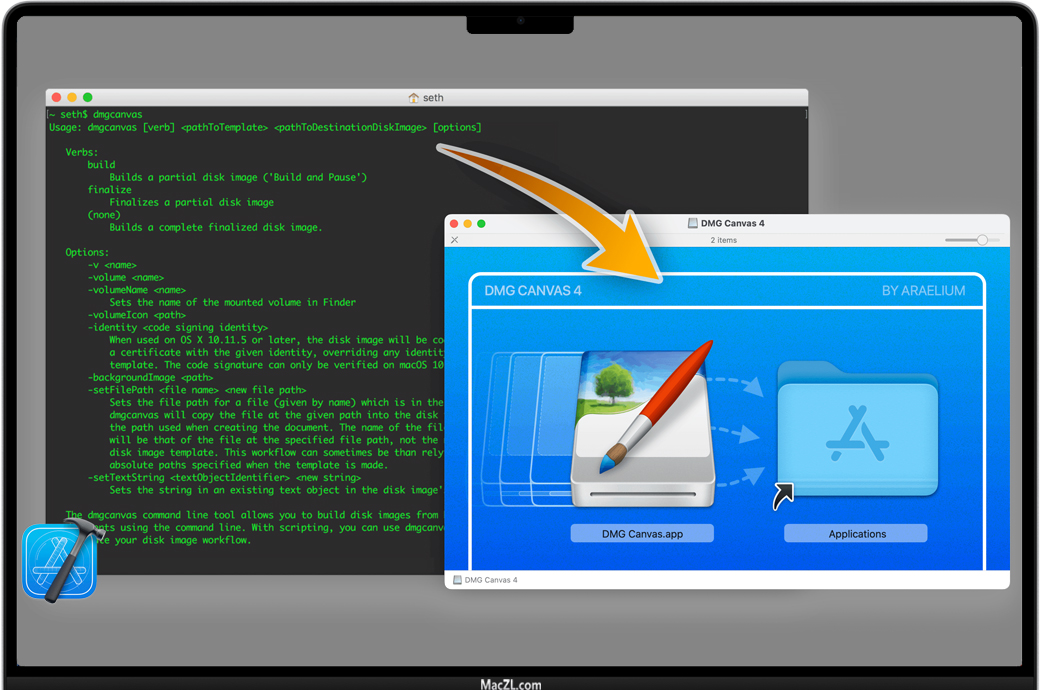 尽管点击DMG Canvas中的Build按钮是小菜一碟,但如果你不需要,为什么要点击它呢?通过使用dmgcanvas工具,你可以将构建磁盘镜像整合到你的正常构建工作流程中,比如在Xcode中构建一个应用程序,所以你甚至不必考虑制作磁盘镜像;它已经为你完成了。为了满足macOS的Gatekeeper,你现在可以用你的开发者ID证书对你的磁盘镜像进行代码签名,避免麻烦的路径随机化。