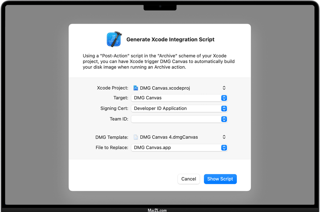您不仅可以将DMG Canvas集成到您自己的构建脚本和工作流程中,而且DMG Canvas本身可以生成一个脚本,将其集成到您的Xcode项目中 在您的Xcode项目和DMG Canvas文档中,选择一些设置,脚本就会在瞬间出现。把脚本放到您的归档方案的 "Post-action "脚本中,然后每次您在Xcode中归档您的应用程序时,它就会自动创建一个磁盘镜像,供您运送给您的用户。