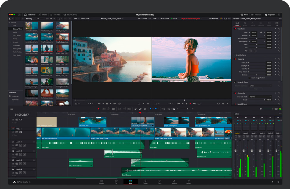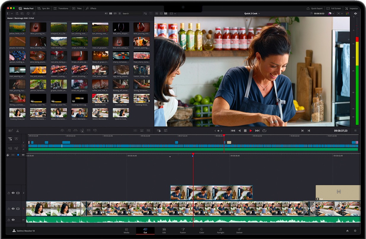 快编页面专为时间紧迫、需快速交付的项目设计,旨在提升剪辑速度。同步素材箱和源覆盖工具是剪辑多机位节目的快捷方式。借助双时间线、源素材带和智能剪辑工具,您的工作效率将大幅提升。快编页面新增垂直时间线布局、画外音面板、专用关键帧编辑器、MultiText 工具、全新实时覆盖控件等功能!