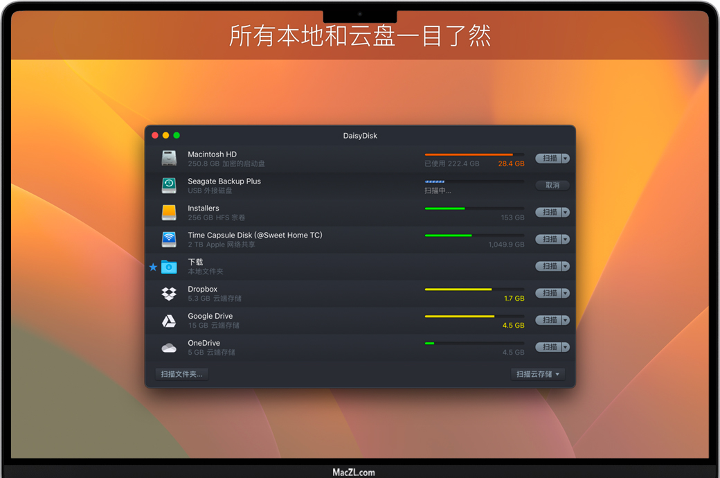 DaisyDisk还为您提供了所有已连接磁盘的概览,无论是Macintosh HD,Thunderbolt磁盘,闪存,网络存储,您都可以对其进行命名。