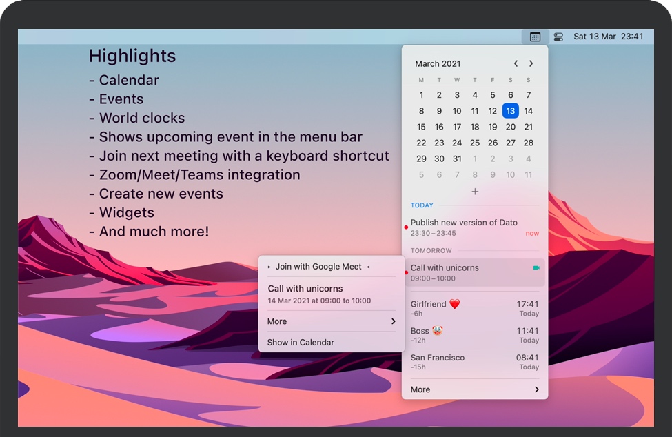 Dato for Mac 在菜单栏中为您提供本地时钟、日期和多个世界时钟。当您单击菜单栏中的 Dato 时,您会看到一个包含日历、日历事件和世界时钟的菜单。所有这些都是高度可定制的。Dato 支持 macOS 支持的菜单栏文本、日期、时间和日历的所有区域设置和语言,但菜单和首选项仅支持英文。Dato仅以英语提供,它将永远不支持农历。