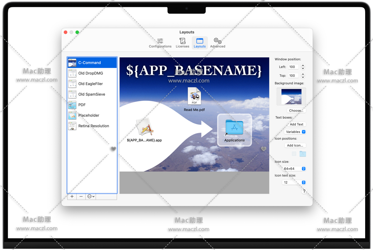 在.dmg文件中交付您的Mac应用程序,其中包含软件许可协议、自定义音量图标以及Retina优化背景图片上方的精确图标布局。客户只需将应用程序拖放到方便的应用程序文件夹链接即可安装。