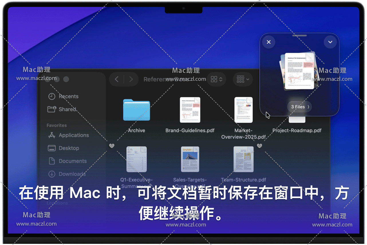 适用于任何内容将各种类型的项目拖到书架上,包括文件(例如文件夹)、文档、图像、URL、文本片段,甚至是来自您最喜欢的浏览器的网页图像。 |