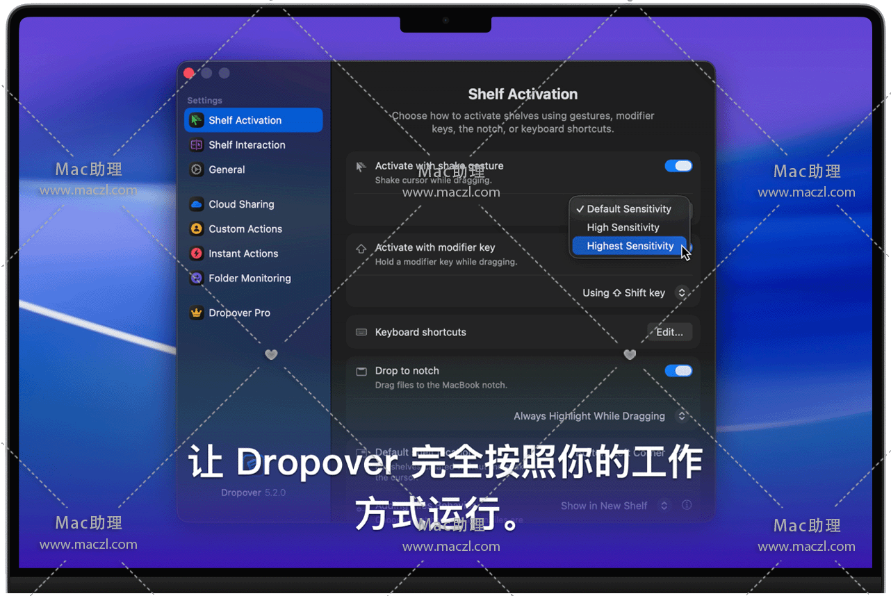 根据工作流程自定义根据您的工作流程定制 Dropover。您可以为书架命名并用颜色编码以便轻松整理,创建自定义操作以快速完成任务,并个性化设置以满足您的独特需求。