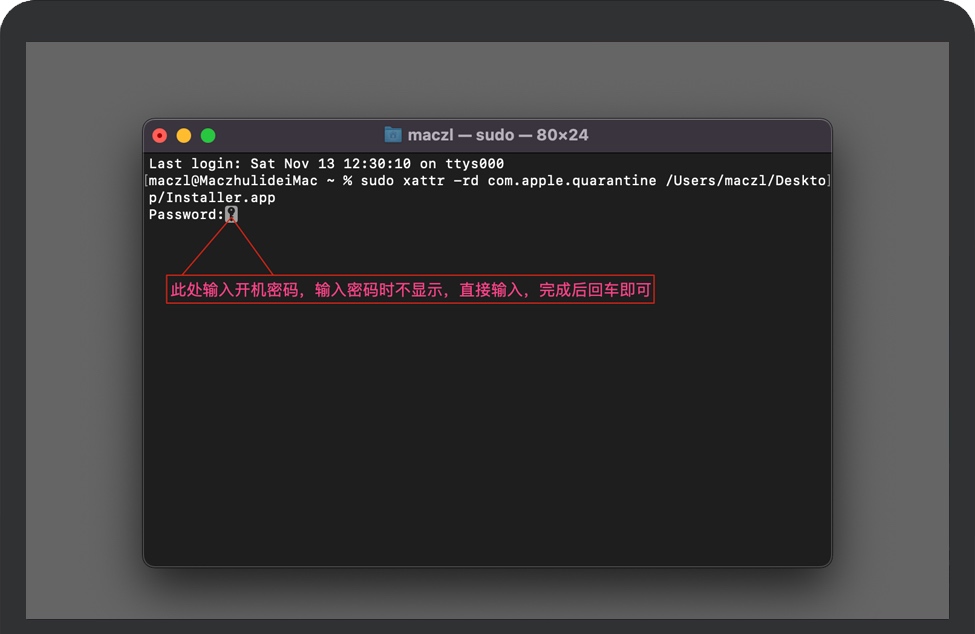 然后打开“终端”工具,复制sudo xattr -rd com.apple.quarantine (代码后面有一个空格)粘贴到终端上,继续把桌面的“Install”拖到终端窗口上,然后按下回车键。