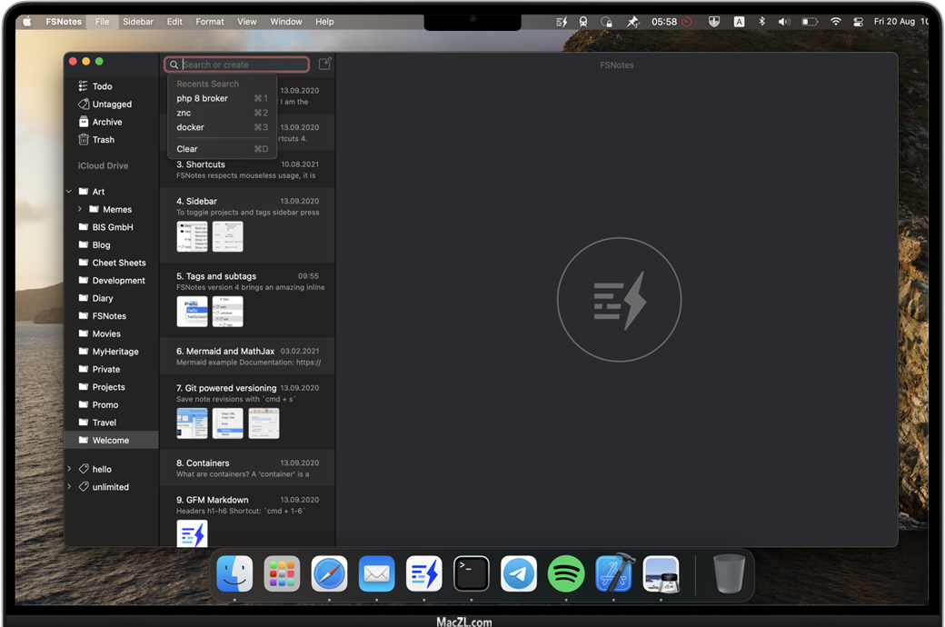 FSNotes for Mac 是一款Mac助理为大家整理的苹果电脑上本地笔记应用,支持markdown、rtf、txt格式,它将数据存储在本地文件系统中而非云端,安全,稳定。在FSNotes应用程序的帮助下,您可以创建和管理大量的笔记数据库,而无需使用鼠标。而且每个FSNotes功能都有一个预先定义的键盘快捷键。