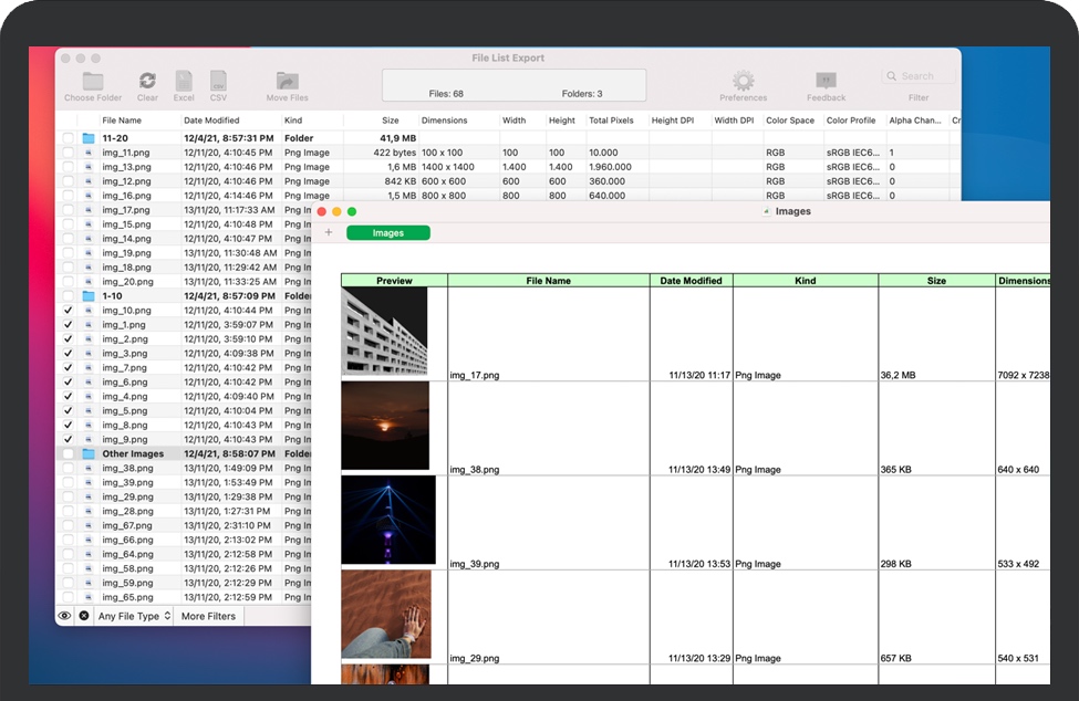 导出到Excel或CSV文件- 将文件列表导出到xls或xlsx,以使用Microsoft Excel或Numbers进行进一步处理。