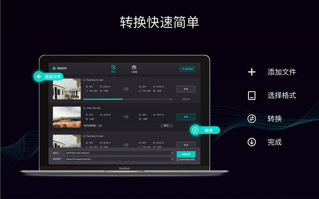 Filmage Converter 视频格式转换工具提供快速转换,高清转换服务。Filmage Converter 几乎可以转换任何格式,可以将任何视频格式转换成 MP4、MOV、3GP、VOB、MKV、M4V、WMV、AVI、MPG、FLV、F4V、SWF、TS等视频格式;也能将视频/音频转换为流行的音频格式,如MP3、WAV、FLAC、AAC等音频格式,满足您的不同的转换需求。