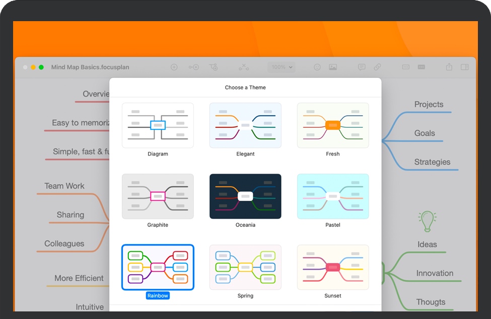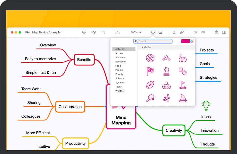 Focusplan Pro for Mac 是一款美观、功能强大且易于使用的思维导图和头脑风暴应用程序。具有优雅且流线型的文档窗口界面,它将所有焦点放在您创建的思维导图上。时尚的设计与您的 Mac 完全集成,从您第一次打开应用程序的那一刻起,您就会立即感到熟悉。因此,思维导图变得比以往任何时候都更直接、更有趣。每个人都可以轻松使用Focusplan。可以帮助您捕捉、发展和分享您的创意,将它们转变成令人惊叹的思维导图。