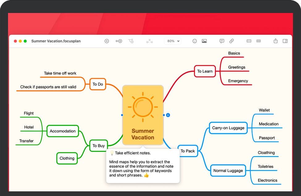 您可以使用思维导图来勾勒项目计划、创建业务策略、组织活动等等。使用思维导图进行规划简单、直观且富有创意。