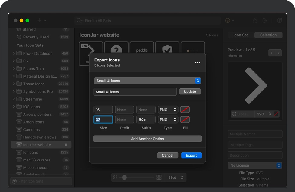导出任何大小,文件类型和颜色的图标。使用我们针对Android,iOS,macOS的内置预设之一来节省时间,或者创建适合您需求的自定义预设。