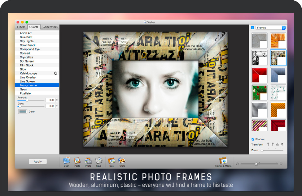美丽的相框我们习惯于在房子周围挂着相框,但有时您只想在硬盘上构图并通过电子邮件将其发送给朋友和家人。使用超过 20 个可自定义的相框,其中一些甚至是可绘制的,让您可以选择颜色。 | ![]() |