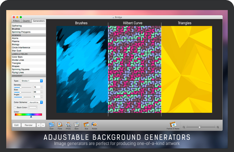 核心图像过滤器使用超过 110 个核心图像滤镜增强照片。 | ![]() 石英成分应用核心图像滤镜的时尚组合。 | ![]() 图像蒙版使用 70 多个图像蒙版来蒙版您的照片。 | ![]() 相框将照片放置在 20 多个数码相框中。 | ![]() 图像生成器为引人入胜的背景制作随机图像。 |