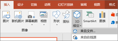1.将三维模型插入文件的方法与插入其他图像的方法基本相同。 在功能区的“插入”选项卡上,选择“三维模型”,然后选择“从文件”(使用“插入”>“三维模型”将三维对象添加到演示文稿)。