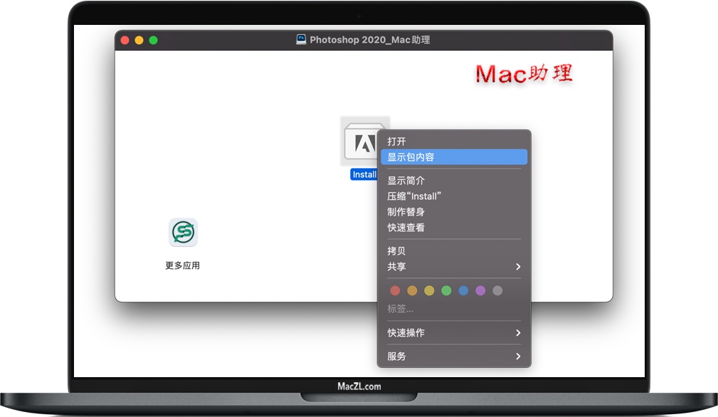 软件下载完成后,打开Ps安装包如上图,选择第一个图标 “Install” 右键→显示包内容