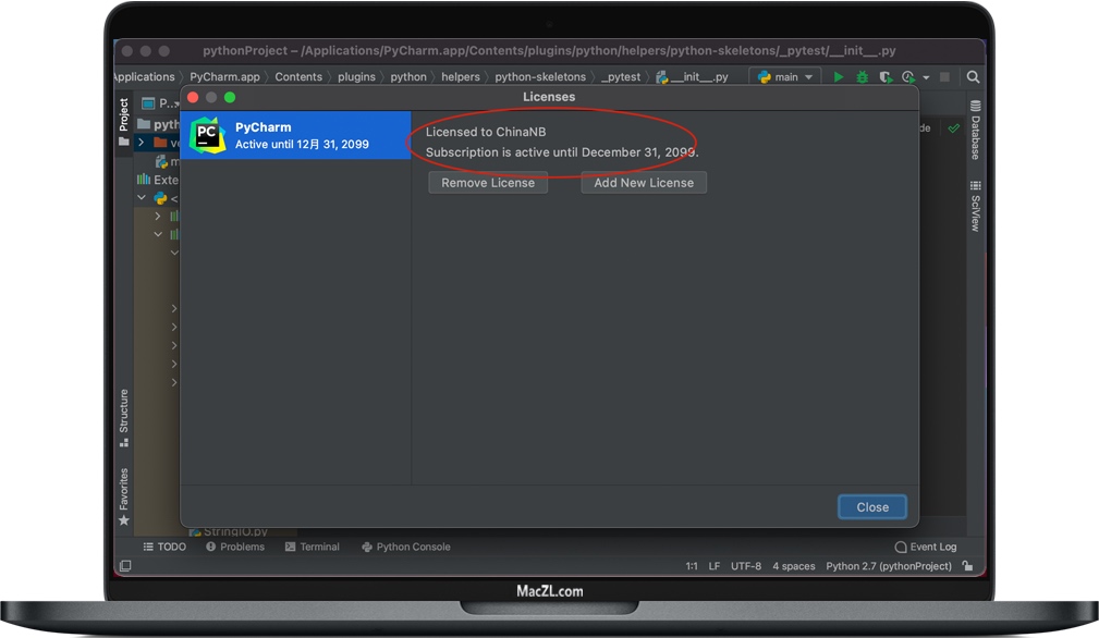 这样先进去软件,随便打开一个或者新建一个窗口,如下图,把软件包中的“MacZL”拖到到打开的PyCharm窗口中。