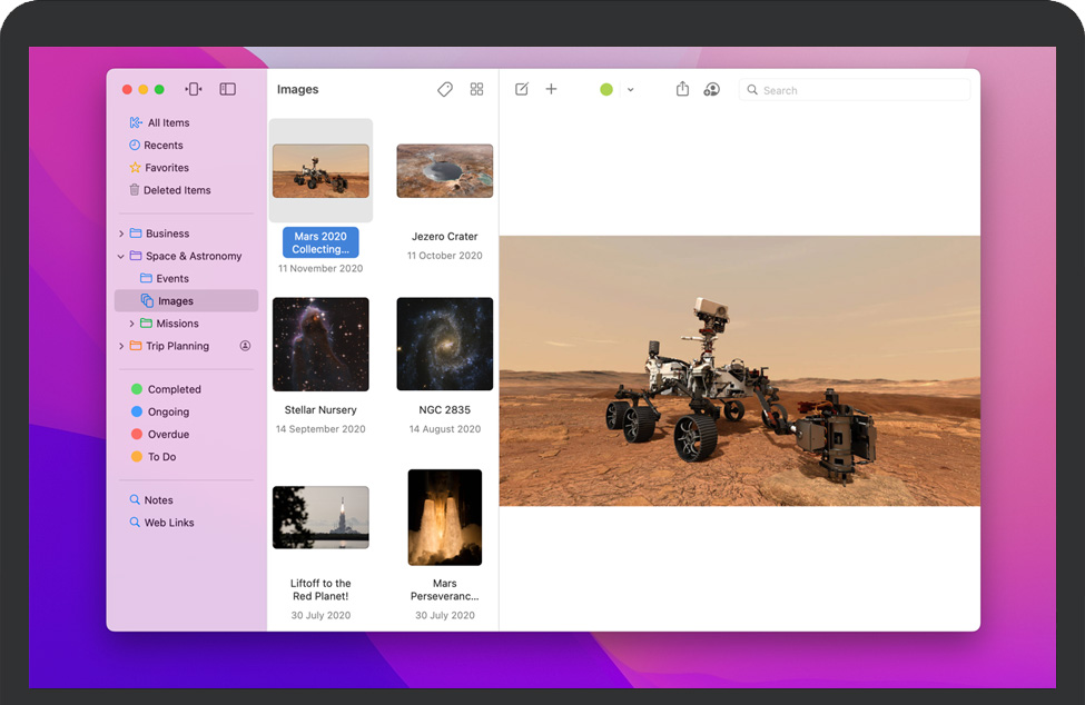 Keep It for Mac 是一款笔记本、剪贴簿和组织者,非常适合写笔记、保存网络链接、存储文档、图像或任何类型的文件,以及再次查找它们。在Mac上可用,Keep It是您想要放置的所有东西的目的地,相信您以后会再次找到它们。Keep It 2 添加了 Finder 集成、快速打开、快速文件、阅读器模式和最小网页、在侧边栏中重新排序列表的能力、重新设计的项目列表、顶部的收藏夹、改进的搜索、改进的 PDF 查看和 Markdown 预览、改进项目之间的链接,复制项目的能力等等。