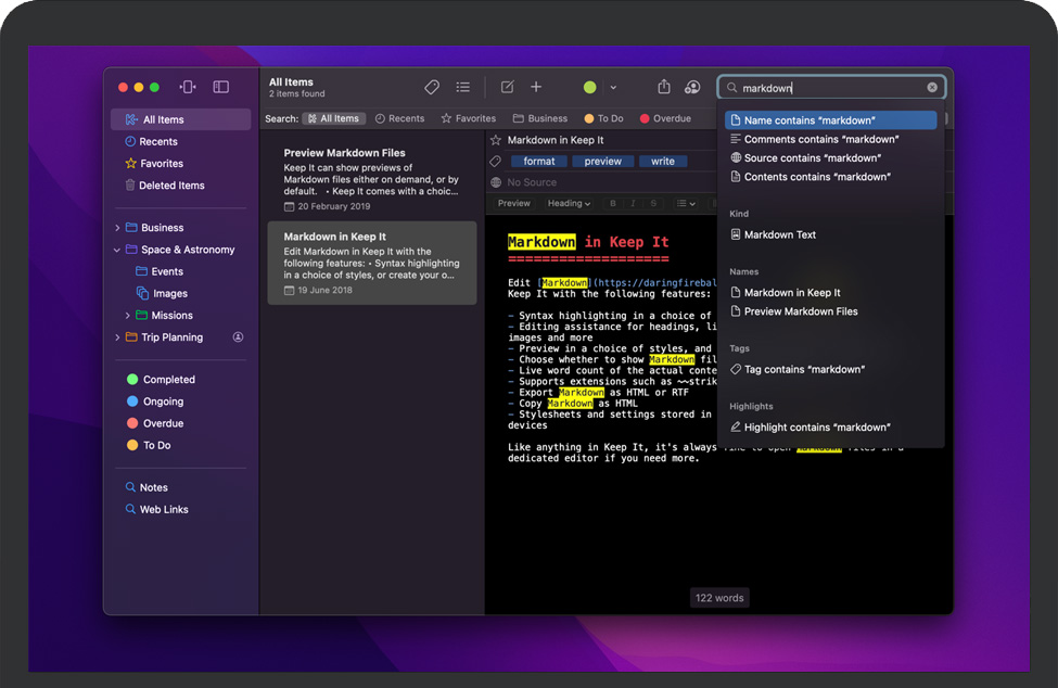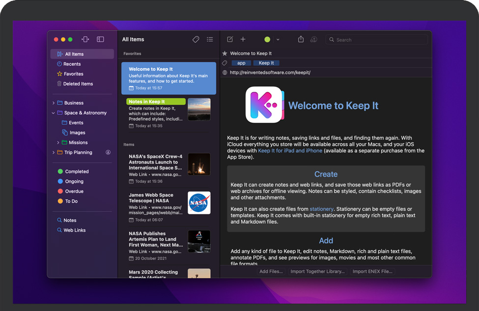 到处Keep It 可以将所有内容存储在 iCloud 中,并通过适用于 iPad 和 iPhone 的 Keep It 在您的所有 Mac、iPad 和 iPhone 上使用。 |
