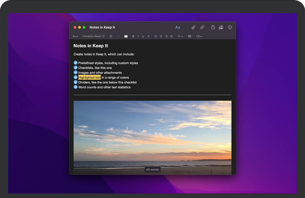 创建具有内置样式的笔记,这些样式在您的所有设备上看起来都很好并且阅读良好。注释可以包含清单、项目符号和编号列表、链接、分隔线、图像和其他附件。