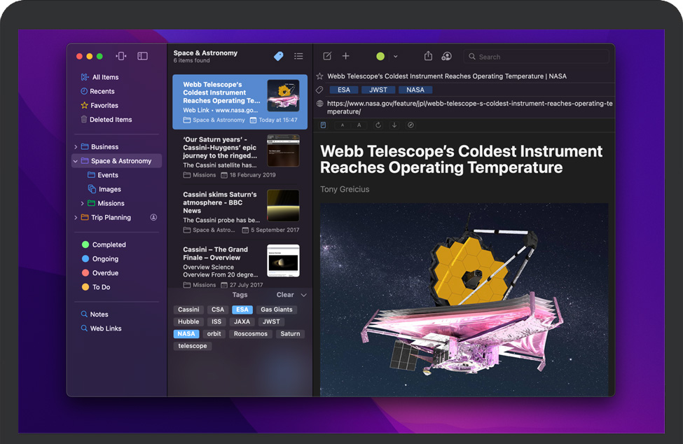 标签使用标签对项目进行颜色编码,以便快速进行视觉识别。标签列在边栏中,因此您可以快速查看带有特定标签的所有内容。 |