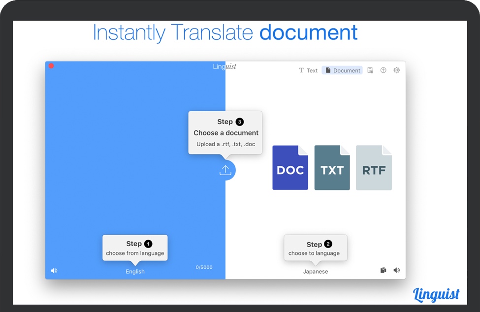 通过单击或命令(HOTKEY)在任何其他应用程序或网站中进行选择,即可翻译单词或短语。它可以翻译.txt,.rtf和.doc格式的文档。