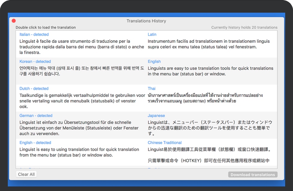 Linguist易于使用翻译工具,还可以从菜单栏(状态栏)或窗口快速翻译。