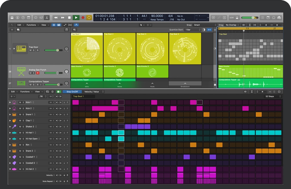 ![]() 实时循环乐段跟着感觉走,即兴可成。实时循环乐段让你能即时灵活地创作和编曲。只需将循环乐段、采样或你的演出录音添加进网格,即可开始作曲。只要触发不同的单元格,就能来场灵感演绎,不必担心时间轴或编曲流程的问题。组合出完美搭配的乐声以后,你便可创建歌曲的各个段落,然后再将全部内容移至音轨区,继续制作并完成你的作品。 | ![]() 步进音序器韵律节拍,铿锵而来。步进音序器的设计灵感源自经典鼓机及合成器。使用步进音序编辑器,你不仅可以快速制作鼓点节拍、低音线及旋律,甚至还能自动化处理常用的插件。你也可借助多种富有创意的播放方式,在音乐模式中加入精妙的变奏。更可运用音符重复功能制作滚动步进,通过几率功能随机播放步进,或使用连接步进功能打造更长的音符。 |