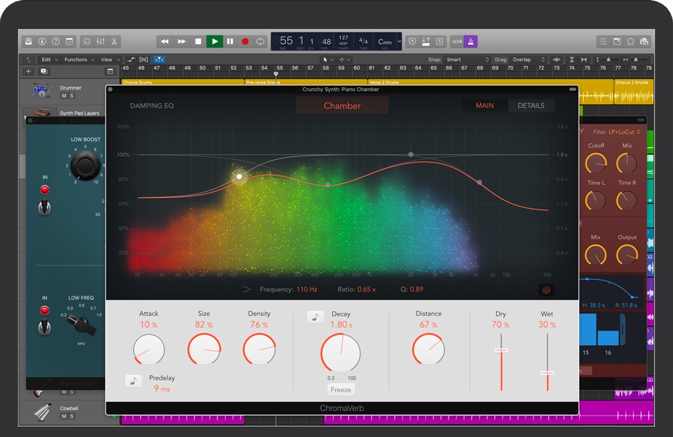 制作效果运用全套动态处理器、均衡器和其他制作效果,让你的歌曲和各种音频作品如天籁般动听。 | 基于所选部分的处理使用内置的 Logic Pro 插件或来自音频单元的任何第三方效果,可将效果直接永久性地渲染到一个音频文件的任意部分,或一次渲染到多个文件。 |
