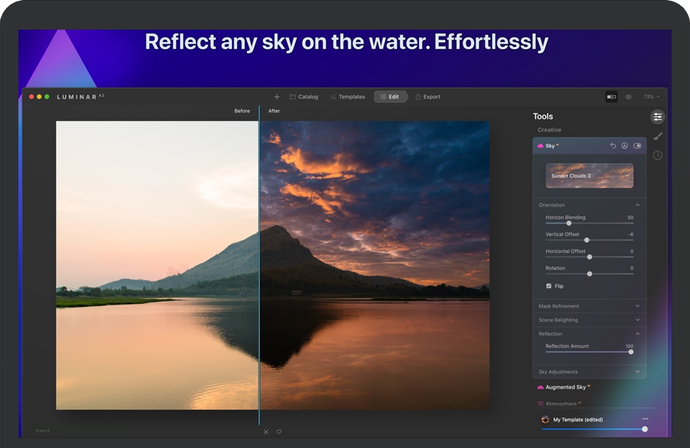 无聊或平坦的天空可能会破坏完美的照片。一键更换天空,无需遮罩或分层。Sky AI甚至会处理最小的细节,使您的新天空看起来栩栩如生且令人惊叹。从丰富的内置天空中选择,或上传自己的天空。
